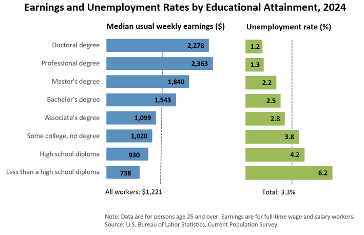 This is actually a very underappreciated aspect of being an educated worker - the ability to switch industries, roles, or even whole professions. This is where the benefits of education in general, covered in 3.2 below, show themselves in the professional world. The fundamental skills you gain through education allow you to tackle many different types of problems. Therefore, you can do many different types of work that have low supply and high demand, and you can always improve through the process of learning. This unlocks so many possibilities and flexibility in your career, especially in comparison to uneducated workers or even trades workers.