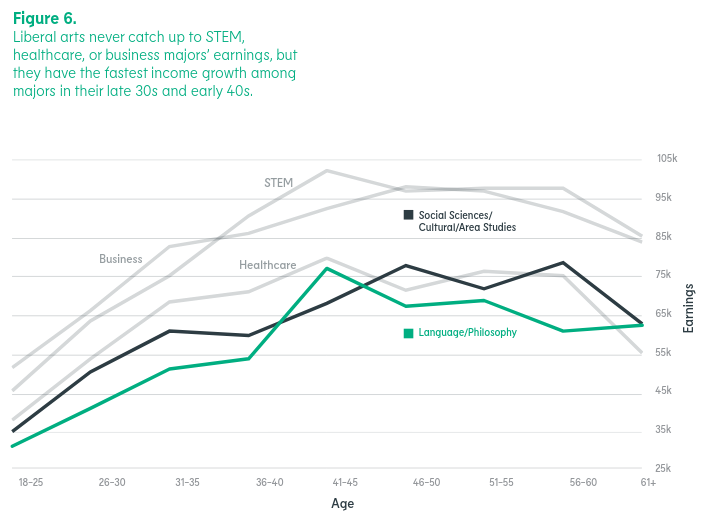 Another limitation is that all careers, young and old, are lumped together. The longer you stay in a career, the more people you know, the better you are in that field, the more opportunities you’ll have… the older your carer, the further you venture into a low supply, high demand market (see this report for what this looks like for liberal arts students).