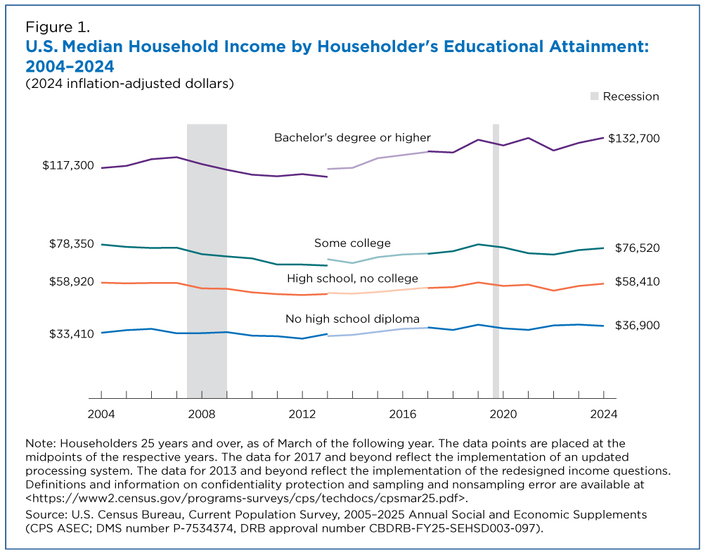 Now, the first figure only gave data for 2024. You will see a lot of alarmism online that degrees are becoming less valuable over time. This is not supported by the data (which is no guarantee of future performance, but there is really no evidence to suggest all degrees are significantly losing their value rapidly…). As you can see in the second figure, these trends have held strong for two decades (and longer). We will discuss the limitations of this data soon and what to be weary of, but buying into extreme alarmism about the economy and education will probably only hurt you (through stress and fear preventing you from living your best life).